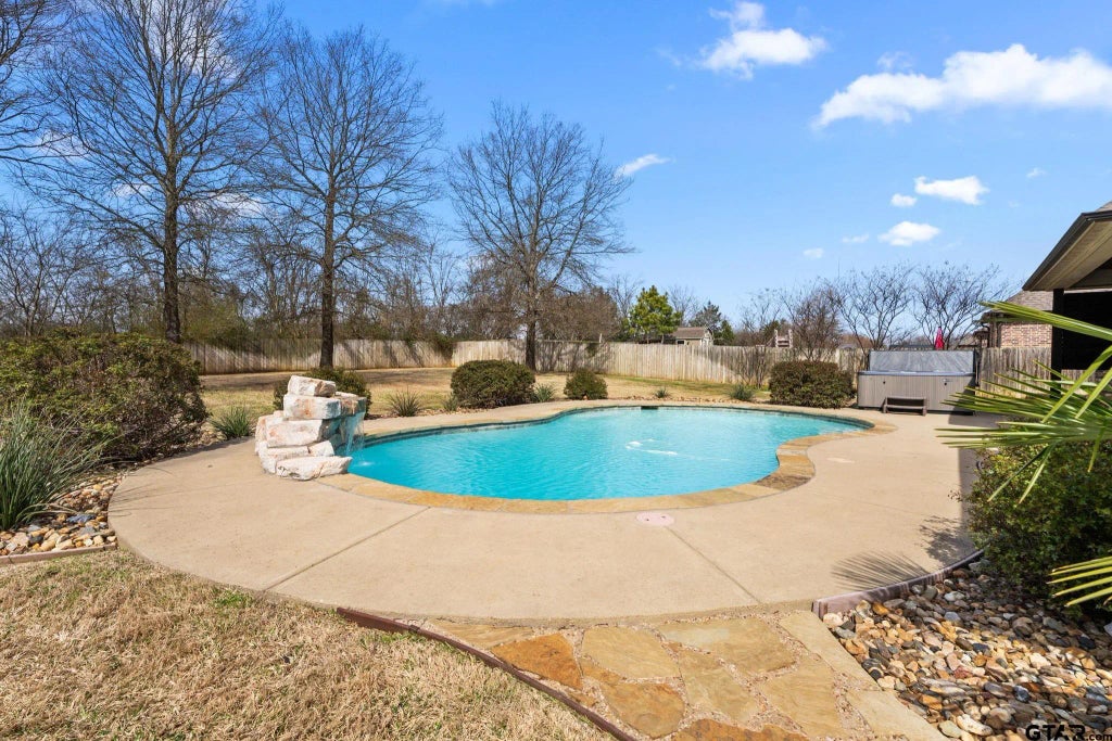 Nestled in the sought-after Hunters Creek subdivision within Bullard ISD, this remarkable home offers the perfect blend of elegance, comfort, and entertainment- all set on a spacious 1/2 -acre cul-de-sac lot. Step inside to discover a beautifully designed open floor plan, featuring a stunning family room with soaring 13-foot vaulted wood ceilings and a striking stone fireplace- the ideal centerpiece for cozy gatherings. The chef's kitchen is a culinary dream, complete with granite countertops, Whirlpool stainless steel appliances, and a breakfast area large enough to seat your entire family-with even more space in the formal dining room for special occasions. Retreat to the romantic primary suite, where a sophisticated triple tray ceiling with mood lighting sets the tone for relaxation. Two expansive to die for walk -in closets provide ample storage and luxury. For added versatility, Bedroom #4 easily transforms into a home office- perfect for remote work or creative pursuits. Step outside, and you'll find an entertainer's paradise. The expansive covered patio boasts a fully equipped outdoor kitchen with a Memphis pellet grill and refrigerator, and built in storage, while the sparkling pool with a stone waterfall and relaxing hot tub offer a resort-like experience. The fully fenced yard offers ample open space and includes a storage building with loft storage for added convenience. This incredible home is truly a rare find- combining luxury, functionality, and charm in one stunning package. Don't miss your chance to call it yours!
