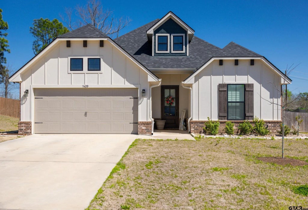 GREAT LOCATION! This like-new home is located in the sought after Eagle Meadows subdivision, right across the street from Lindale Junior High School. Constructed at the end of 2022, this home offers 4 bedrooms and 2 full baths. Home has 9 foot ceilings, and 10 foot ceilings in the entryway, living room, kitchen, and primary bedroom. The kitchen boasts a large, granite countertop island, with a walk-in pantry and wet bar. Premium finishes throughout the home, along with a stunning electric fireplace. The large backyard is perfect for outdoor entertaining, and is enclosed with a wooden privacy fence. Included in this home is a 10 year air conditioning warranty, 8 year foundation warranty, and is pre-wired for an electric vehicle outlet. Enjoy the short walk to the track and tennis courts at the junior high school, and relax now that you are home!