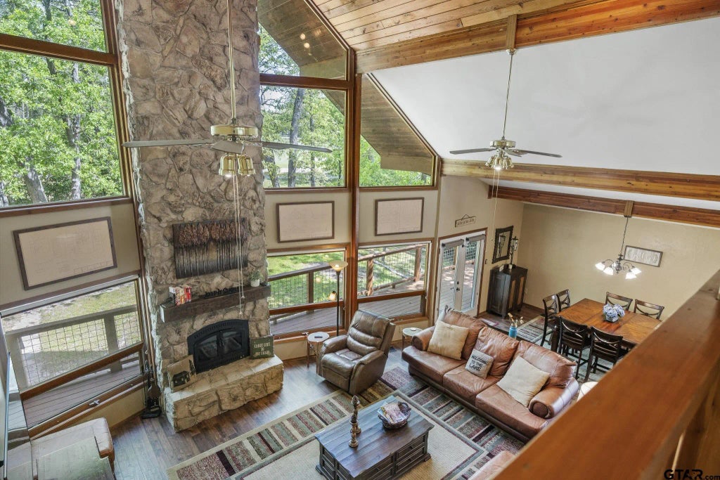 MOTIVATED SELLER! Stunning custom-built 1.5 story Lindal Cedar Home on wooded Golf Course lot in beautiful resort-style-living Holly Lake Ranch. Think Swiss Chalet with soaring vaulted ceilings, wood beam accents & a wall of windows for breathtaking views. Living Rm has stunning rock fireplace with combustion furnace insert for clean burning heat in living room, windows overlooking the wooded area & 13th Fairway, & doors leading to wrap-around deck. Light filtering roller shades & laminate wood flooring on main floor. Living room opens up to dining & kitchen. Kitchen has solid soft-close maple cabinets, granite countertops, pot & pan drawers, island with storage & pull-out pantry cabinets. Kitchen opens to light & bright sunroom with windows all around...or can be breakfast nook. The spacious primary bedroom with vaulted ceiling has doors leading out to the deck. Ensuite bathroom has a jetted tub, separate shower, 2 sinks & walk-in closet. Bedroom 2 is next to a full bathroom...perfect for guests. The 3rd BR off of the kitchen has a walk-in closet that could be used as a 2nd pantry. Laundry closet is located in this bedroom & accommodates a full-sized washer & dryer. Cedar stairway leads to the upstairs loft overlooking the living area and outside views. Huge loft is perfect as a 4th bedroom plus plenty of room for a sitting area or TV room. Loft has a full bathroom plus an extra storage closet. Proceed to the side deck & over to the bonus room above the garage. This approx 581 sq ft space with mini-split AC-Heat is perfect for a game room with plenty of room for beds too. It has a built-in desk area, cabinets & 2 storage closets. This space is NOT included in the advertised sq footage. Awesome wrap-around deck is perfect for entertaining & enjoying nature. Oversized garage includes golf cart parking. Complete with outside elevator for moving furniture, groceries...or people who don't do stairs. Walk-in basement storage with access to utilities. HVAC '23, WH '25..