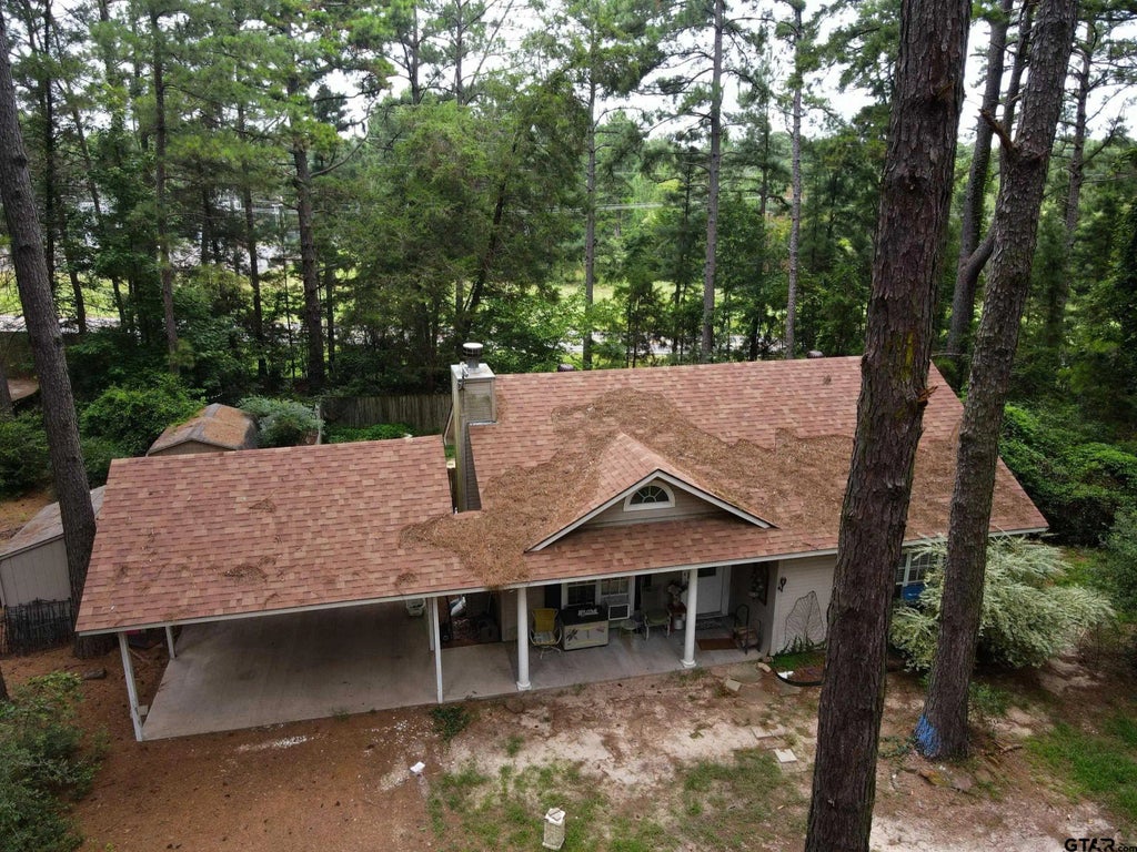 Attractive 2BR-2BA home on 1/2+acre wooded lot with room for RV or workshop. Open concept LR/DR/KIT with soaring wood plank ceilings & WBFP in living room. Kitchen has oak cabinets. Oak floors in main area & hallway. Carpet in bedrooms has been removed and floors are concrete, Italian tile in baths, crown molding and 9 ft ceilings throughout. Attached 2 car carport, covered front porch and open deck with privacy fence in back. 2 storage buildings. Refrigerator conveys. Seller would appreciate a 60 day closing to provide adequate time to transition off the property. Enjoy the natural beauty of the neighborhood as you watch the deer that often visit the neighborhood. Holly Lake Ranch address but NO HOA and NO HOA DUES!
