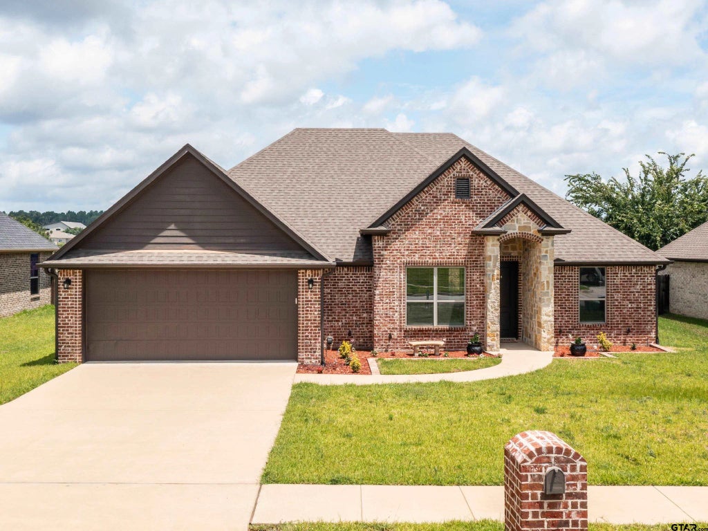 Beautiful 5-year-old home located in the Rockpoint subdivision in South Tyler, just a short walk from Jack Elementary and zoned to the highly sought-after Jack/Three Lakes/Legacy school district. Sitting on a corner lot, this home makes a statement with its 10’ and 12’ pitch rooflines and a grand entry. Inside, you’ll find 3 spacious bedrooms, 2 full bathrooms, a formal dining room, and a massive kitchen with an island that’s roughly 4'x8'—perfect for entertaining or family meals. The home also features granite countertops, custom cabinets, tons of crown molding, a cozy wood-burning fireplace, and 13’ ceilings that give it an open, airy feel. The primary suite has a separate shower and garden tub, plus a large walk-in closet. Out back, enjoy the covered patio, privacy fence, and full sprinkler system. This one checks all the boxes—come take a look before it’s gone!