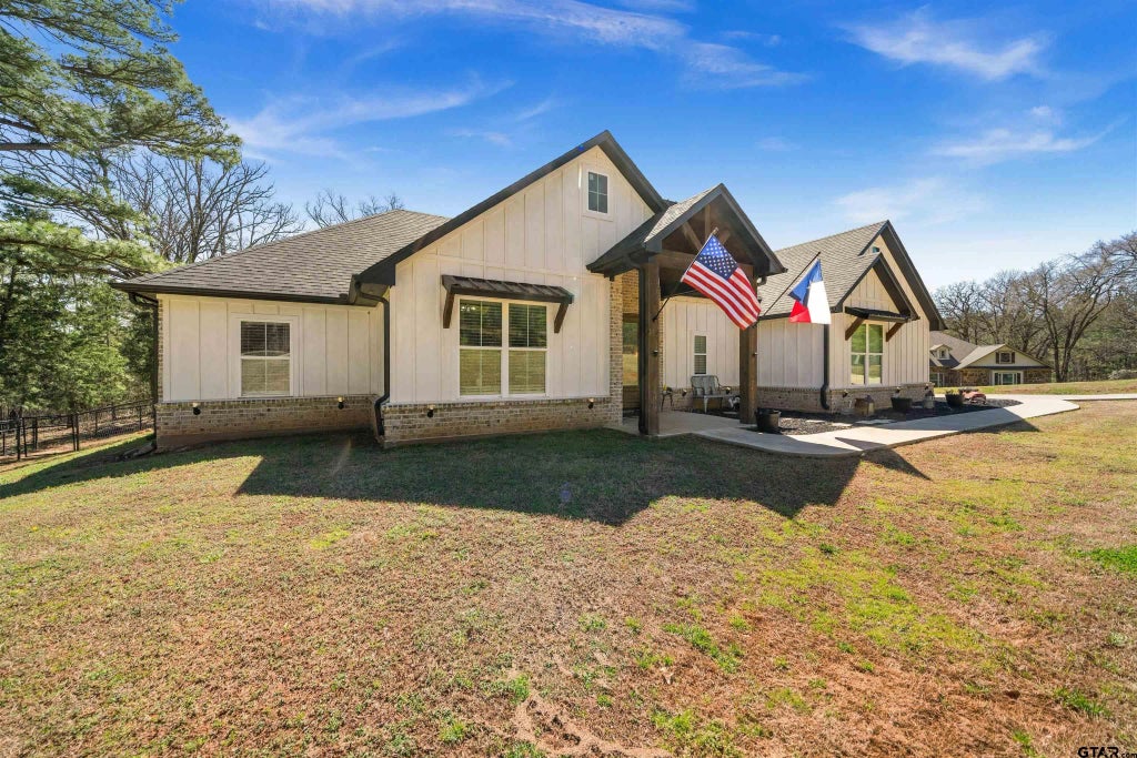 Welcome to this exquisite 1-story home nestled in a quiet, private cul-de-sac just outside the Hideaway community, with easy access to I-20 and Toll 49. This beautifully designed home offers 4 spacious bedrooms and 2.5 bathrooms, featuring high-end finishes and custom details throughout. Upon entry, you’ll be greeted by vaulted ceilings and sleek black matte fixtures, creating a contemporary yet inviting atmosphere. The open-concept living space seamlessly connects to the kitchen, which is a true chef’s delight. Enjoy cooking on your gas cooktop and quartz countertops, surrounded by stainless steel appliances, custom soft-close cabinetry, and a huge hidden pantry for all your storage needs. Relax in the large living room with a cozy fireplace, perfect for unwinding after a long day. The large primary retreat offers a private sanctuary with double sinks, a walk-in closet, and an oversized shower, plus a soaking tub offering both style and function. For added convenience, the laundry room is equipped with built-in cabinets and directly connects to the master closet, making laundry day a breeze. Step outside onto your covered patio that out looks the turf area and low-maintenance landscaping. The patio is also pre-plumbed for an outdoor kitchen, making it an ideal space for entertaining. Enjoy peaceful views of the surrounding piney woods from your inside and outside. The 16x30 carport can store all your outdoor toys, boat, trailer or cars! The oversized 2-car garage is perfect for your vehicles and storage needs, featuring a storage closet and epoxy floors for durability and easy maintenance. This property is fully fenced with pipe fencing and ready for you to call home. Electrical panel is ready for power outages with a whole house generator plug. Don’t miss out on this rare gem that combines comfort, privacy, and easy access to all the best amenities and located in the award winning LISD.