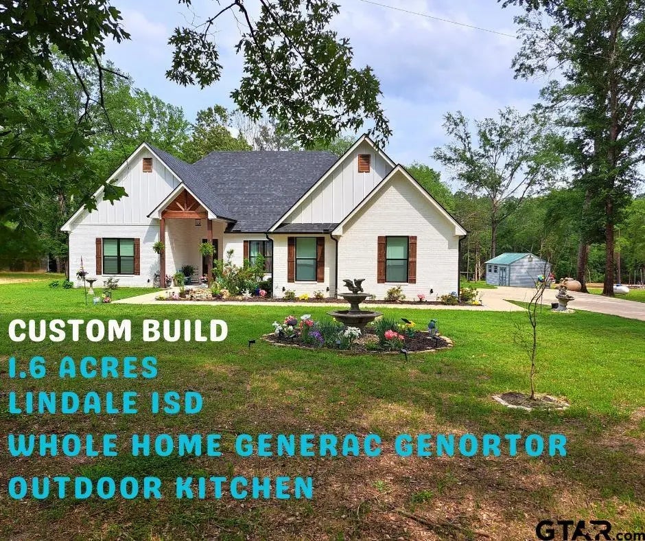 Welcome to this stunning custom-built 2023 modern farmhouse, offering the perfect blend of luxury, functionality, and peaceful country living—all just minutes from local amenities. Nestled on 1.6 beautiful acres in the award-winning Lindale ISD, this 5-bedroom, 2-bath (additional plumbing, option to add a third bathroom if desired)Home boasts 2,406 sq. ft. of thoughtfully designed space, with the potential to expand into the attic for even more room. From the moment you step inside, you'll notice the vaulted living room ceiling, anchored by a cozy wood-burning fireplace. The kitchen is a showstopper, featuring a 10-foot granite island, ceramic farmhouse sink, ceiling-height cabinetry with display lighting, and a charming coffee bar to start your mornings right. Retreat to the spacious primary suite, complete with a bay window bench with storage—perfect for reading or letting your favorite plants bask in the sun. Step into the luxurious en-suite bathroom with dual vanities, built-in corner storage, a massive 4'x5' marble walk-in shower with dual shower heads, including a 12-inch rain shower, and enjoy your favorite tunes with the Smart Bluetooth speaker overhead. Function meets finesse in the oversized laundry room, featuring custom wrap-around cabinetry, a mud bench, and direct access to the oversized custom primary closet. *Foam insulation throughout, including above the garage. Garage also insulated. *2.5-car garage with a storage room, workspace, and 220V plug. *Govee permanent outdoor lighting with Alexa/Google compatibility for festive flair year-round*Outdoor granite-top kitchen with propane grill, mini fridge and sink. *24k whole-home Generac generator with a 250 lb propane tank to keep you powered up anytime. *Raised garden beds. *Bedroom 5 can easily function as a home office with built-in cabinetry. This home truly has it all- Schedule your private tour today!