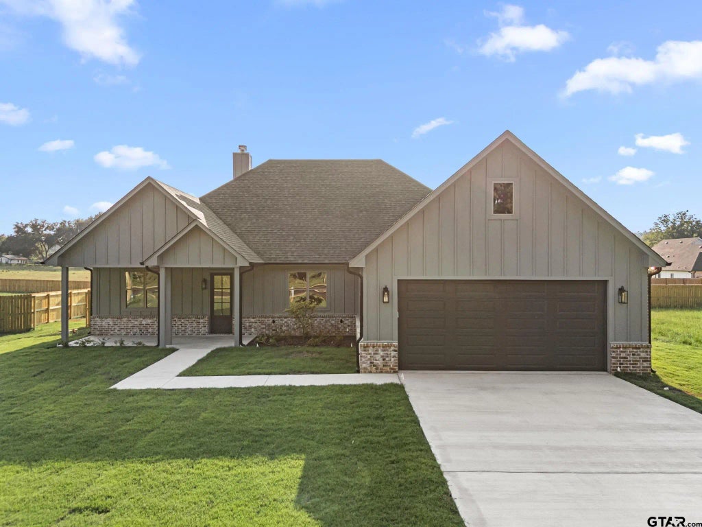 Step into this stunning 3-bedroom, 2.5-bath home with a dedicated office and 2,230 square feet of stunning, custom living space—all nestled on a spacious half-acre lot. This beautifully crafted home features an open-concept layout that effortlessly blends luxury and comfort. The heart of the home centers around a warm fireplace and an expansive kitchen island, ideal for hosting family dinners or casual gatherings. The split-bedroom floor plan provides both privacy and functionality, with generously sized secondary bedrooms and a serene primary suite tucked away for added seclusion. The private office offers a quiet space for remote work, study, or hobbies. High-end finishes and quality construction throughout the home give it a timeless and elevated feel. Outside, enjoy a fully fenced backyard with plenty of room to relax or entertain. Located just minutes from Tyler with easy access to Hwy 155 and Toll 49, this home offers the perfect blend of quiet privacy and city convenience. With no HOA and room to customize, this new build is ready for your personal touch. Don’t miss your chance—schedule your showing today!