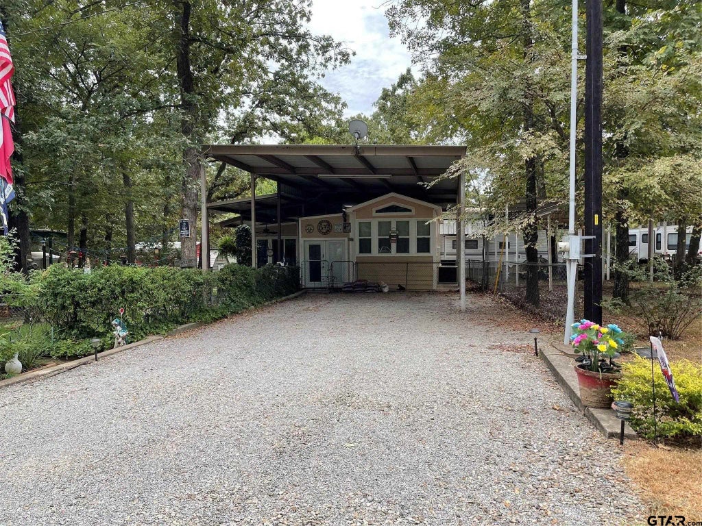 Located in the highly desirable community of White Oak Shores on the World Famous Lake Fork. This property boasts 4 spacious adjoining lots. There is a spacious park model that has a large 18x33 living room addition. The park model features a cozy bedroom, full sized kitchen and a spacious bath with double shower. On the adjacent lots there is an oversized metal cover that can fit multiple boats or an RV. In addition there a 2 storage buildings. There yard is so relaxing with the fire pit and garden and it is completely fenced with chain link. White Oak Shores features a private boat ramp and dock, community facilities and a community pool for homeowners use.
