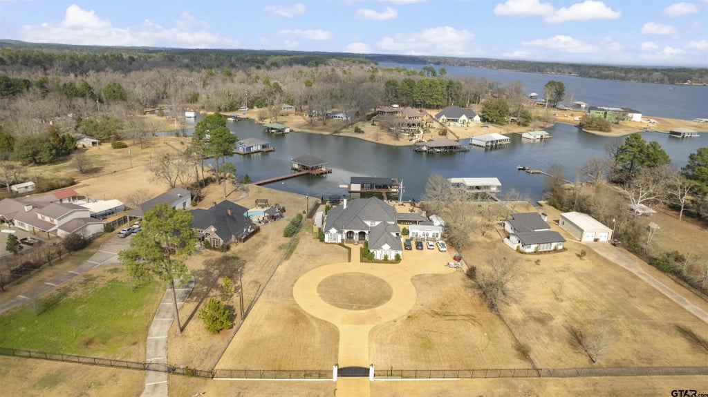 Stunning 5,776 sq.ft. lake-front home on beautifully landscaped property with breathtaking views. Home features a 2.5-car garage, stucco exterior, arched windows, and a circle driveway that adds sophistication and extra parking. Wrought-iron fence and gated entry ensure privacy and security. You'll be captivated by hand-scraped hardwood floors and panoramic views of beautiful Lake Tyler! The heart of the home is the open-concept living room with wall-to-wall windows of the resort-style pool, lake, and outdoor living space! The kitchen is a chefs dream with black horse granite countertops, updated appliances, including an 7-burner gas range with a pot filler and a double fridge, a prep kitchen with additional cabinetry, range and fridge, a large walk-in pantry and dining area! The primary suite is conveniently located on the main floor with an amazing view of the pool and grotto and includes an exterior door for access to the back yard. The luxurious spa-like bathroom showcases a freestanding tub, steam shower, double vanity with ample cabinet and counter space, and leads to the custom closet equipped with washer and dryer hook-ups and endless storage options. The main floor also includes 3 living rooms and a home office that could be used as a 5th bedroom, a full guest bathroom and a half-bath. Upstairs features a game room, living room, 2 full bathrooms and 3 bedrooms, each with a walk-out balcony. Step outside to your private oasis designed for relaxation and entertainment, with two covered patios, a detached pool bath with an outdoor shower, large sun deck, newly resurfaced pool with beach entry, a wet and dry grotto, waterside, swim-up bar, sunken dry bar, tanning ledge and hot tub! Lake access is supported by a concrete retaining wall and features a boat dock with a spacious and inviting entertainment area, large storage closet, upstairs sun deck, a boat lift, wakeboard boat lift and a jet-ski lift for 3!