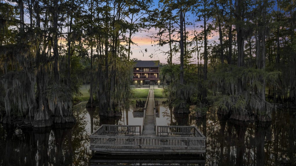Discover one of the most unique opportunities ever offered on Caddo Lake — a rare combination of waterfront living and unrestricted acreage. This remarkable property includes a beautifully crafted elevated home on a double lot plus 30± acres across the street with a private 7-acre pond, totaling approximately 32 acres of East Texas beauty. A package like this is truly unheard of. The waterfront home is designed for both comfort and durability, featuring an elevator, real wood floors, plantation shutters, and abundant natural light. The spacious kitchen boasts granite countertops, JennAir appliances, custom cabinetry with pull-outs, and a large walk-in pantry. The primary suite offers travertine finishes, double vanities, a jetted tub, and a tiled shower with body sprays. Additional highlights include a cozy living area with a gas-log fireplace, a game room upstairs that could easily convert to additional bedrooms, and a storm-shelter bath with workshop space downstairs. Outdoor living is front and center with expansive porches, a large fire pit, and a private pier extending into deep water (approx. 25–28 ft). Recent upgrades include rebuilt exterior concrete stairs and pier, ensuring years of worry-free enjoyment. The home’s spray-foam insulation and dual HVAC systems provide energy efficiency and comfort year-round. Across the street lies the true showpiece: 30 acres of unrestricted land with a private, named 7-acre pond, surrounded by woods and trails. Perfect for fishing, hunting, or simply enjoying nature, this acreage offers endless possibilities for recreation, development, or creating your own private retreat. From sunrise views over the water to peaceful walks around the pond, this property offers a lifestyle rarely found in East Texas. Whether you’re seeking a family retreat, a legacy property, or a one-of-a-kind recreational escape, this Big Cypress Bayou estate delivers it all.
