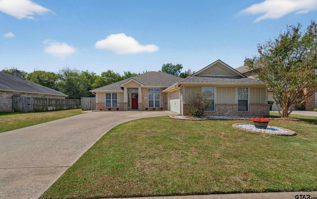 Welcome to this inviting 4-bedroom, 2-bathroom home in the heart of Flint, Texas - a thriving and growing community just minutes from Tyler. This thoughtfully designed property offers a spacious split-bedroom layout, perfect for both comfort and privacy. The master suite is tucked away on its own side of the home, with two additional bedrooms conveniently sharing access to a Jack & Jill bath. A fourth bedroom, currently used as a flex space, makes the perfect guest suite, playroom, or hobby room; offering endless possibilities. Step inside to discover hardwood flooring in the main living area, multiple spaces for gathering, and a formal dining room and office accented with a tasteful blue/teal color scheme that brings a pop of personality against the otherwise neutral palette. The large, open kitchen features abundant cabinetry, ample counter space, and Whirlpool and GE appliances, along with upgraded light fixtures. The kitchen flows seamlessly into the living room and formal dining area, making it ideal for entertaining. The living room is anchored by a cozy gas log fireplace, creating the perfect backdrop for relaxing evenings without the hassle of wood and ash. Outside, you’ll find a fully fenced backyard with direct gated access to the greenbelt walking trail for the neighborhood, offering both privacy and convenience for daily strolls or outdoor play. To make this home even more attractive, ask about potential seller contributions toward buyer closing costs and, as an added bonus, the sellers will cover the HOA fees for the first two years, giving you peace of mind and extra savings right from the start. Flint is one of East Texas’ most desirable areas, combining small-town charm with proximity to excellent schools, shopping, and dining. This home offers both functionality and warmth, ready to welcome its next owners. Don’t miss the chance to make this beautiful property yours. Schedule a private showing today!