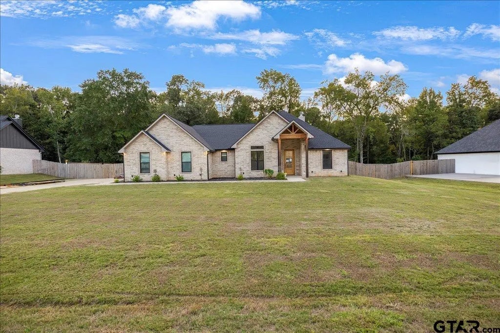 Welcome to 14544 Fallow Lane in sought-after Lindale ISD! This stunning new construction sits on a spacious half-acre lot, fully fenced for privacy and enjoyment. With over 2,100 sq ft, the home offers 4 bedrooms, 2.5 baths, and an open-concept design that blends modern style with everyday comfort. Inside, the living space showcases exposed beams, a striking gas fireplace, and eye-catching brick pillars that set the tone for quality and character. The kitchen is built for both function and beauty with a gas cooktop and plenty of space to gather. The master retreat is your private escape with a soaking tub, walk-in shower, and generous layout designed for relaxation. Step outside to a covered back patio overlooking the large yard—perfect for entertaining, playing, or simply enjoying the view. Ideally located just outside Tyler and Lindale, this home offers both convenience and a touch of country living. Move-in ready—come see it today!